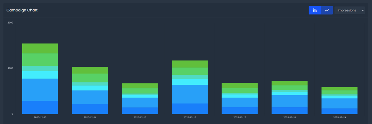 The campaign analysis chart features a metric selected from the chart dropdown listed by the campaign creatives across the date range selected.