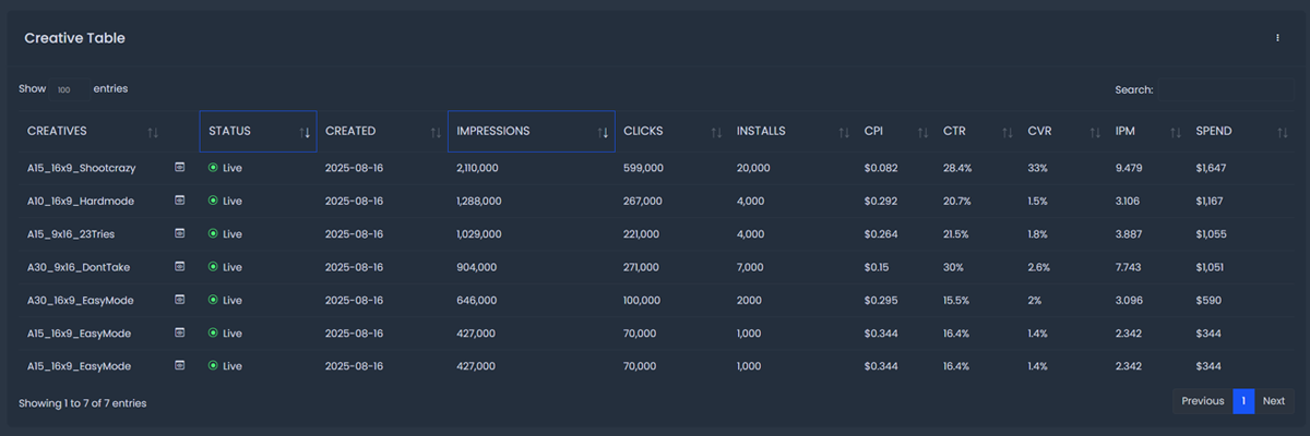 | Impressions | Total number of impressions in the creative within the date range selected. |