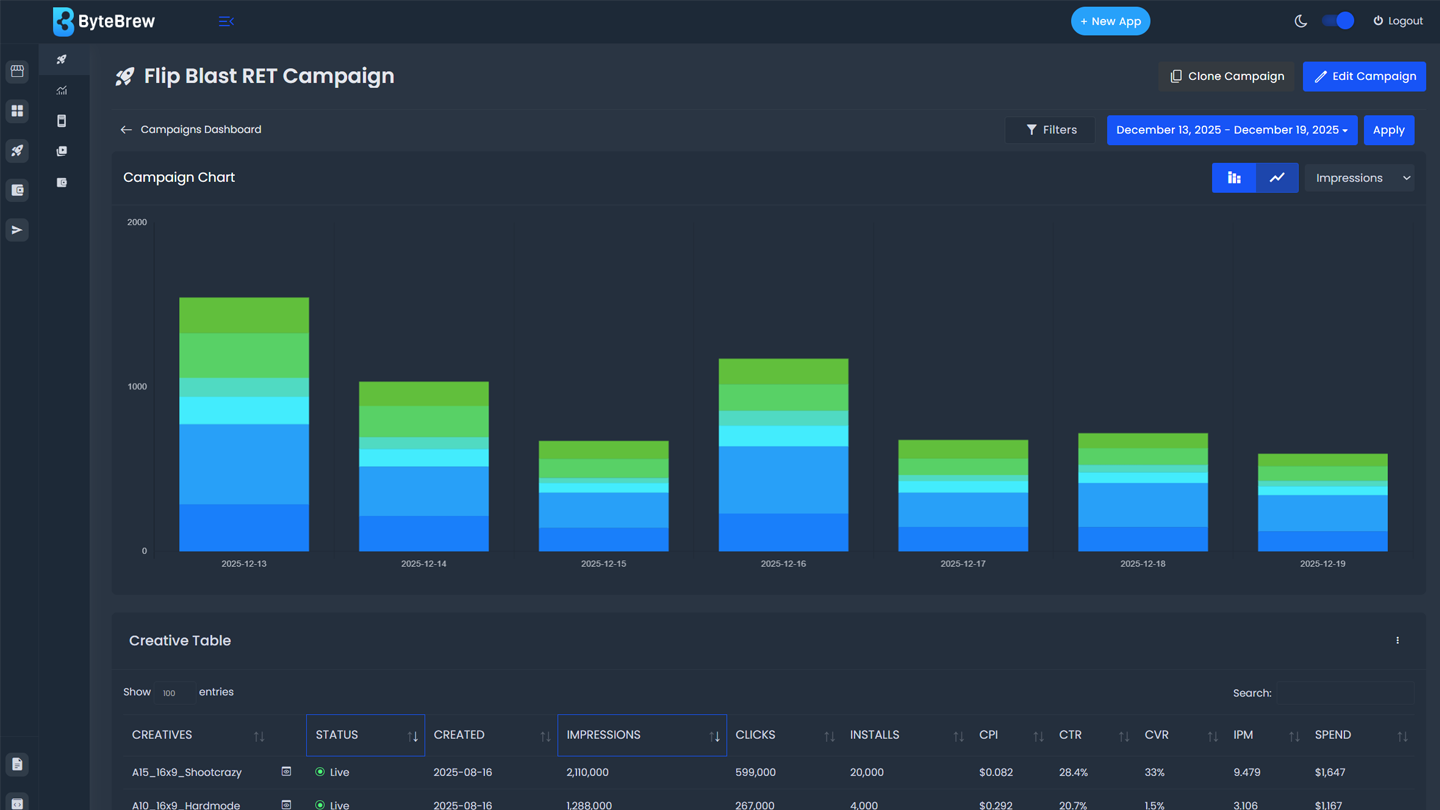 Located by selecting a campaign under the Campaign Overview, the Campaign Analysis dashboard enables you to manage campaign settings and analyze core performance metrics from the live creatives in the campaign.