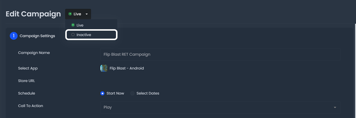 To stop campaigns from serving in your app, select the campaign status field and select "Inactive". Make sure to save your edits after changing the campaign status.
